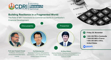 We’re excited to bring you a seminar packed with valuable insights from expert presenter and discussants on “Building Resilience in a Fragmented World: The Role of MFI Transitions to Commercial Banks in Cambodia’s Financial Development".