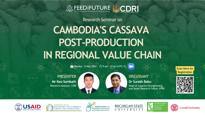 CDRI’s Agriculture Centre is hosting a Research Seminar on Cambodia's Cassava Post-Production in Regional Value Chain, to explore the current state of cassava post-production, the challenges faced, and the potential opportunities that lie ahead to enhance value chain of Cambodia's Cassava in the regional market.