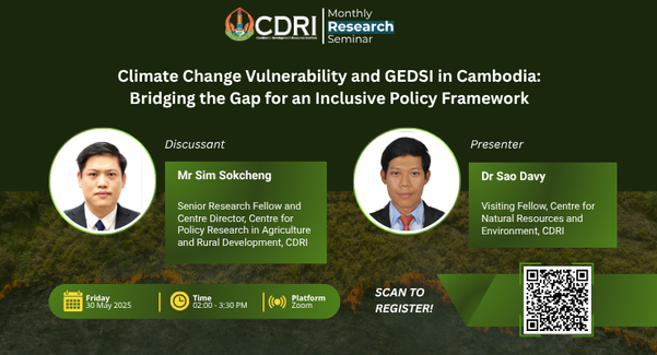 This month’s seminar will cover Climate Change Vulnerability and GEDSI in Cambodia: Bridging the Gap for an Inclusive Policy Framework". This presentation will review and analyse secondary data on climate change and Gender Equality, Disability, and Social Inclusion (GEDSI) in Cambodia. It examines how GEDSI is integrated into climate-related policies and strategies, and evaluates how mitigation, adaptation, and enabling actions, particularly those in the Nationally Determined Contributions (NDC), address the disproportionate impacts of climate change on