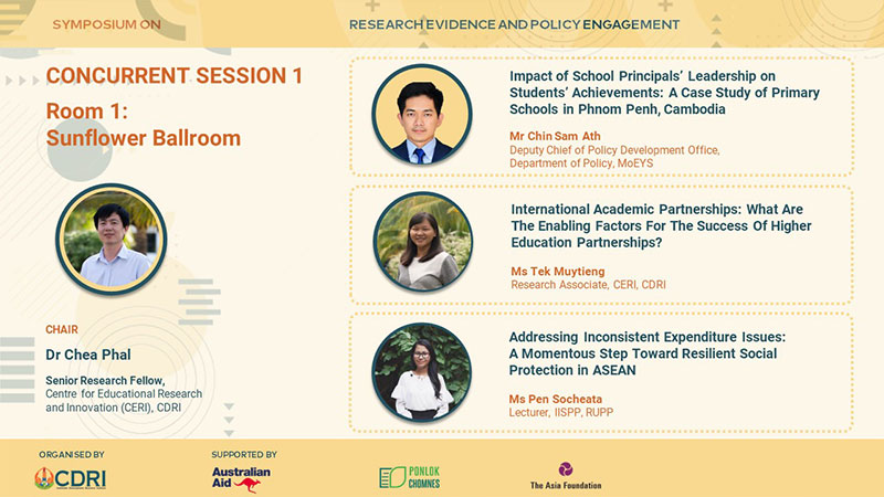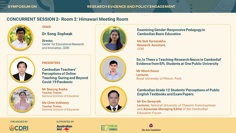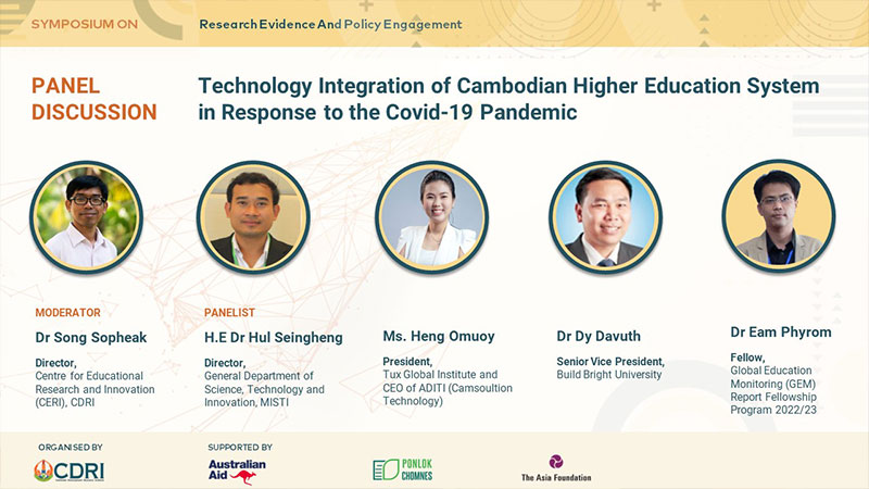 This symposium is to share the findings from CDRI's recent research on technology integration in Cambodian higher education. At the same time, it provides researchers and students opportunities to present their research findings and obtain inputs and feedback from peers, practitioners and experts in their field. Meanwhile, it also offers opportunities for all stakeholders to interact, learn from each other, and build their research networks.