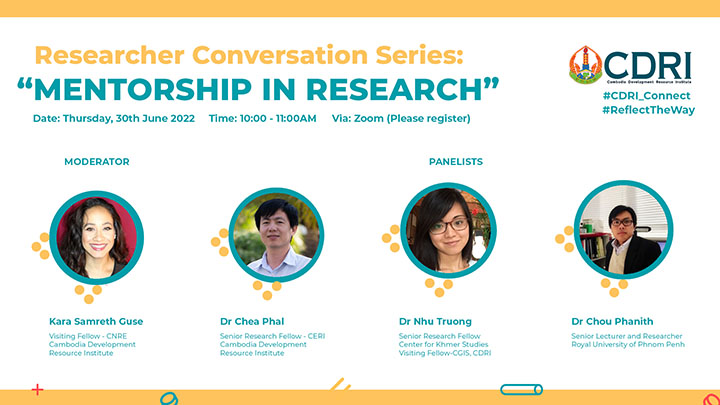 Mentorship is not only for researcher, but for every professional who wish to enhance their knowledge and skills. Mentorship can be either formal or informal, between students and professors and or between peers. Understanding its roles and why it is relevant to research career and capacity building is an interesting and important topic to explore. Considering this reason, Cambodia Development Resource Institute (CDRI) is hosting the second Researcher Conversation Series on Mentorship in Research on June 30. This Researcher Conversation Series following our successful Researcher Conversation Series on Research as Your Career in late March. It is also a part of CDRI's Connect-#ReflectTheWay.