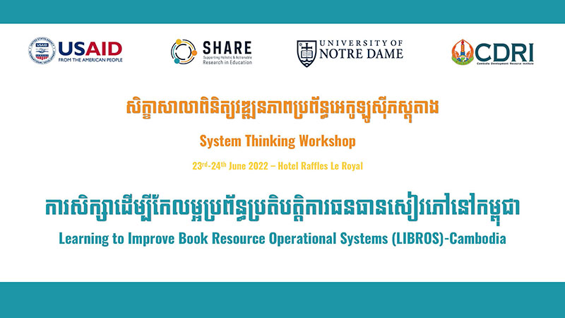 Therefore, to have deeper insights on the book supply chain in Cambodia, Cambodia Development Resource Institute (CDRI) in collaboration with the University of Notre Dame (UND) under financial support from the United States Agency for International Development (USAID) is conducting a two-day System Thinking Workshop on Learning to Improve Book Resource Operational Systems (LIBROS).