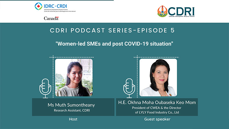 As part of a regional project on “Impacts of COVID-19 on Inclusive Development and Governance: Rapid and Post-Pandemic Assessment in the CLMV", the Cambodia Development Resource Institute (CDRI) is pleased to present CDRI Podcast Series Episode 5 on “Women-led SMEs and post-COVID-19 situation”. Our host, Ms. Muth Sumontheany, Research Assistant of CDRI conversed with H.E. Okhna Moha Oubaseka Keo Mom, the President of Cambodia Women Entrepreneurs Association and founder of LYLY Food Industry Co., Ltd on the status, challenges, and solutions for women-led SMEs in the post-COVID-19 situation in Cambodia.