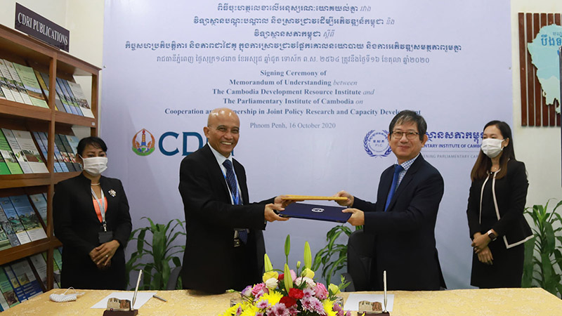 On 16 October 2020, the Cambodia Development Resource Institute (CDRI) and the Parliamentary Institute of Cambodia (PIC) signed a Memorandum of Understanding (MOU) on Cooperation and Partnership in Joint Policy Research and Capacity Development.
