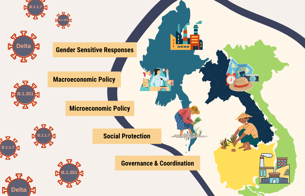 Pillar 1 Macro-economic responses | - RQ1: To what extent fiscal and monetary policies the government can/should adapt and adopt to respond and mitigate risks posed by Covid-19? To what extent are these policies gender sensitive? - RQ2: How does the gender-sensitive and inclusive economy pathway look like in the Greater Mekong Subregion countries? - RQ3: What is the impact of COVID-19 on cross-border trade and investment? And how does it affect supply chains (domestic, regional and/or global)? |