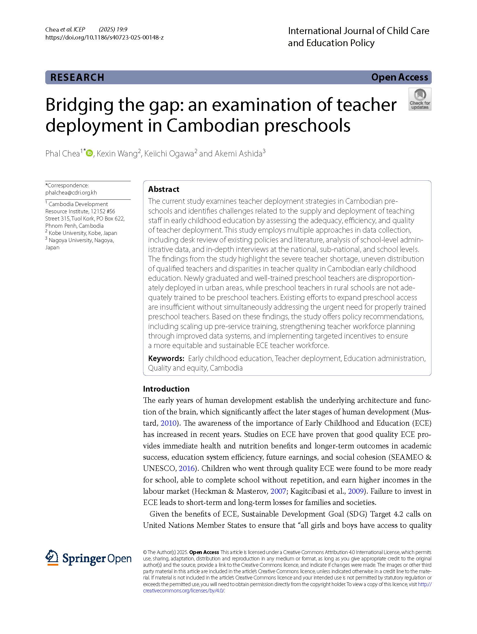 The current study examines teacher deployment strategies in Cambodian preschools and identifies challenges related to the supply and deployment of teaching staff in early childhood education by assessing the adequacy, efficiency, and quality of teacher deployment. This study employs multiple approaches in data collection, including desk review of existing policies and literature, analysis of school-level administrative data, and in-depth interviews at the national, sub-national, and school levels. The findings from the study highlight the severe teacher shortage, uneven distribution of qualified teachers and disparities in teacher quality in Cambodian early childhood education. Newly graduated and well-trained preschool teachers are disproportionately deployed in urban areas, while preschool teachers in rural schools are not adequately trained to be preschool teachers. Existing efforts to expand preschool access are insufficient without simultaneously addressing the urgent need for properly trained preschool teachers. Based on these findings, the study offers policy recommendations, including scaling up pre-service training, strengthening teacher workforce planning through improved data systems, and implementing targeted incentives to ensure a more equitable and sustainable ECE teacher workforce.