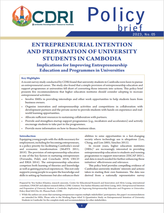 A recent survey study conducted by CDRI found that university students in Cambodia were keen to pursue an entrepreneurial career. The study also found that a simple provision of entrepreneurship education and support programmes at universities fell short of converting those interests into actions. This policy brief presents five recommendations that higher education institutes should consider adopting to increase entrepreneurial activities: