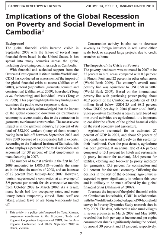 Implications of the Global Recession on Poverty and Social Development in Cambodia
