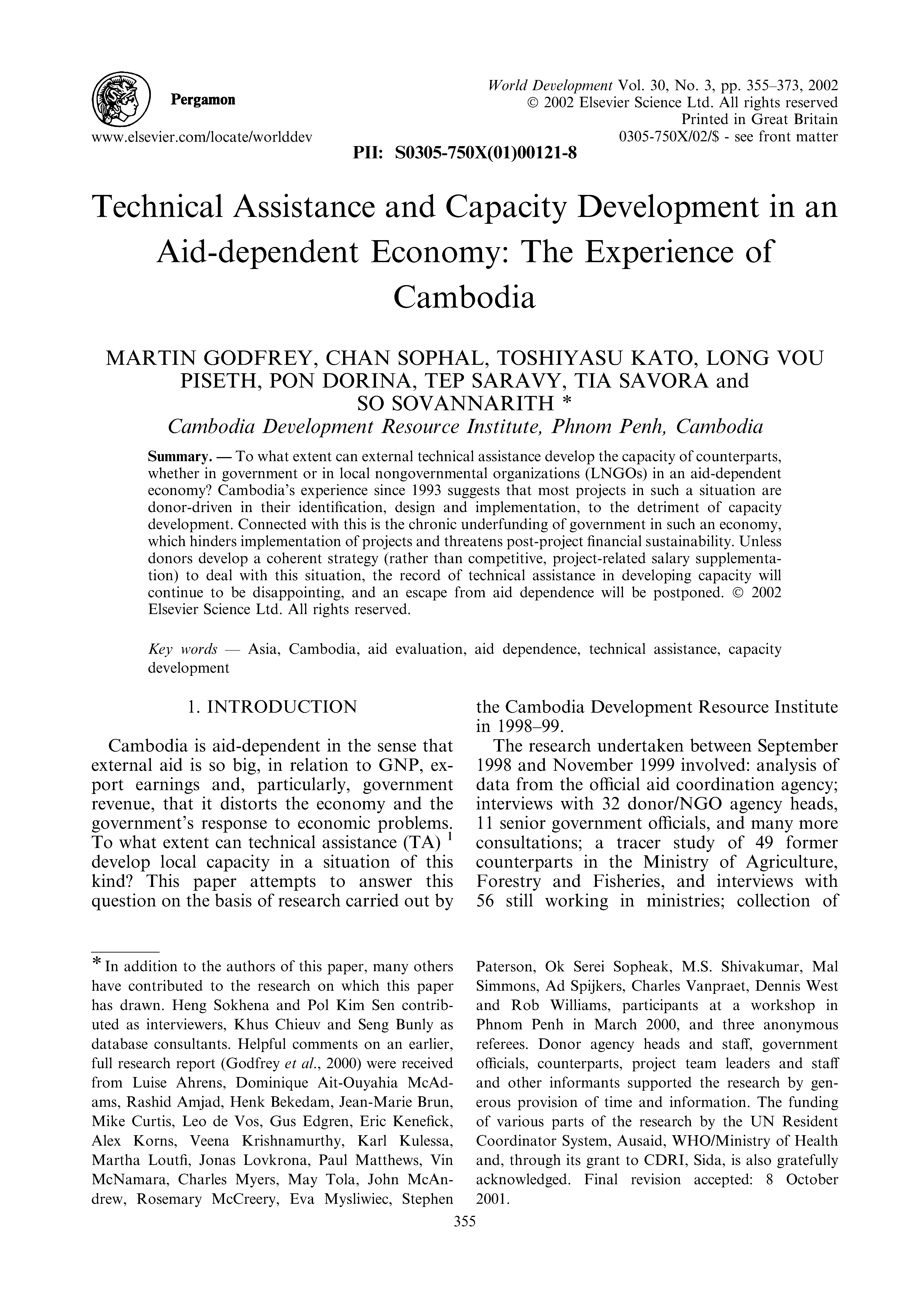 To what extent can external technical assistance develop the capacity of counterparts, whether in government or in local nongovernmental organizations (LNGOs) in an aid-dependent economy? Cambodia's experience since 1993 suggests that most projects in such a situation are donor-driven in their identification, design and implementation, to the detriment of capacity development. Connected with this is the chronic underfunding of government in such an economy, which hinders implementation of projects and threatens post-project financial sustainability. Unless donors develop a coherent strategy (rather than competitive, project-related salary supplementation) to deal with this situation, the record of technical assistance in developing capacity will continue to be disappointing, and an escape from aid dependence will be postponed.