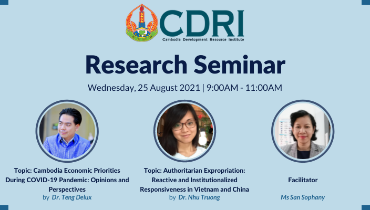 CDRI is hosting our virtual monthly research seminar on Wednesday, August 25, 2021 from 9:00AM - 11:00AM (Phnom Penh time) via Zoom. Two speakers will give presentations on the following topics: Cambodia Economic Priorities During COVID-19 Pandemic: Opinions and Perspectives, by Dr. Teng Delux Authoritarian Expropriation: Reactive and Institutionalized Responsiveness in Vietnam and China, by Dr. Nhu Truong Please kindly access this link or...