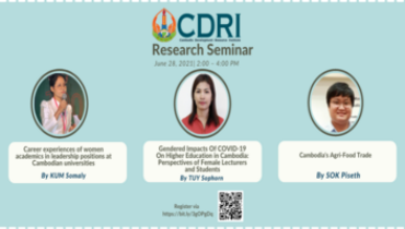 CDRI is hosting our virtual monthly research seminar on Monday, June 28, 2021 from 2:00PM - 4:00PM (Phnom Penh time) via Zoom. Three speakers will give presentations on the following topics:  "Career experiences of women academics in leadership positions at Cambodian universities" by Ms KUM Somaly."Gendered Impacts Of COVID-19 On Higher Education in Cambodia: Perspectives of Female Lecturers and Students" by Ms TUY Sophorn."Cambodia's Agri-Food T...