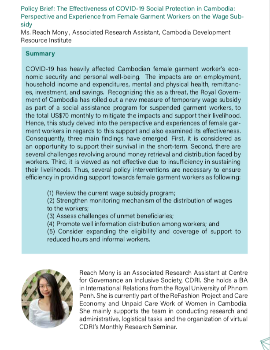 COVID-19 has heavily affected Cambodian female garment workers’ economic security and personal well-being. The impacts are on employment, household income and expenditures, mental and physical health, remittances, investment, and savings. Recognizing this as a threat, the Royal Government of Cambodia has rolled out a new measure of temporary wage subsidy as part of a social assistance program for...