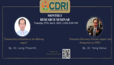 CDRI is hosting our virtual monthly research seminar on Tuesday, April 27, 2021, at 2:00 -3:30 PM  (Phnom Penh time) via Zoom. By topic: Connectivity initiatives in the Mekong region by Dr Thearith Leng Economic Recovery Policies: Aspect and Perspective in PPPs by Dr Teng Delux